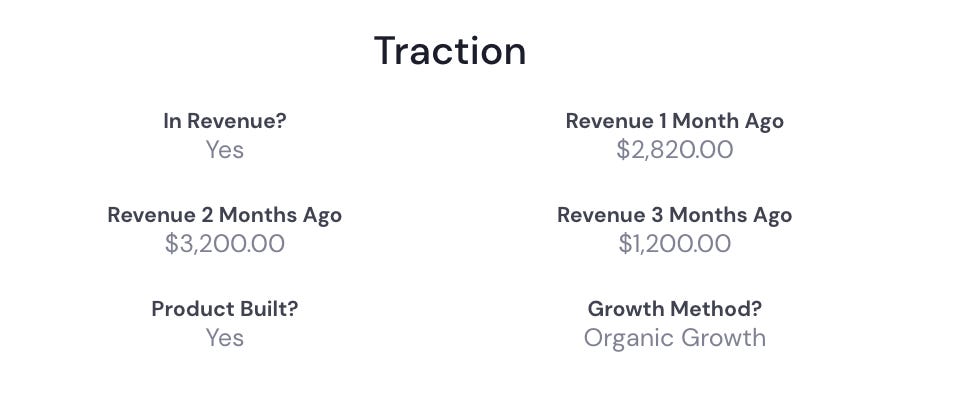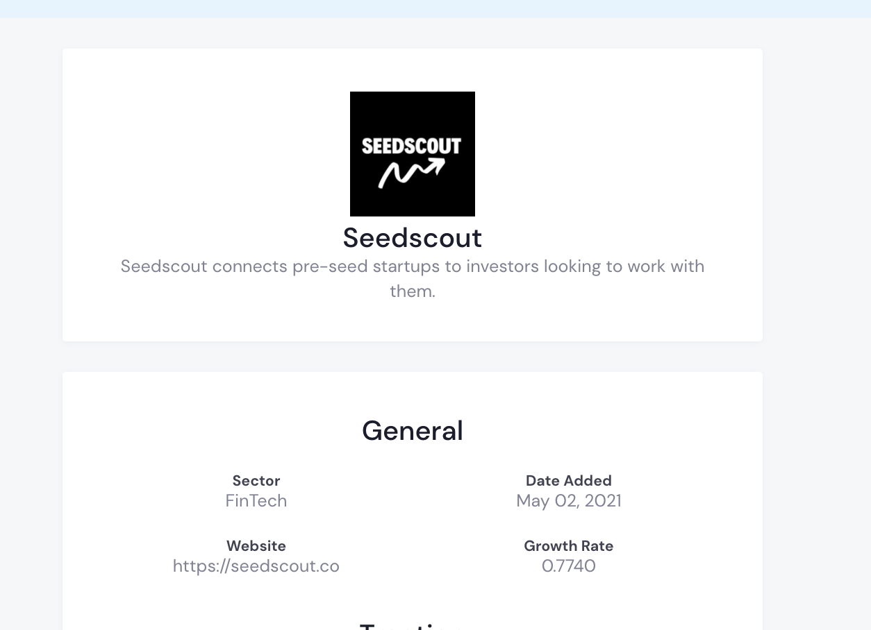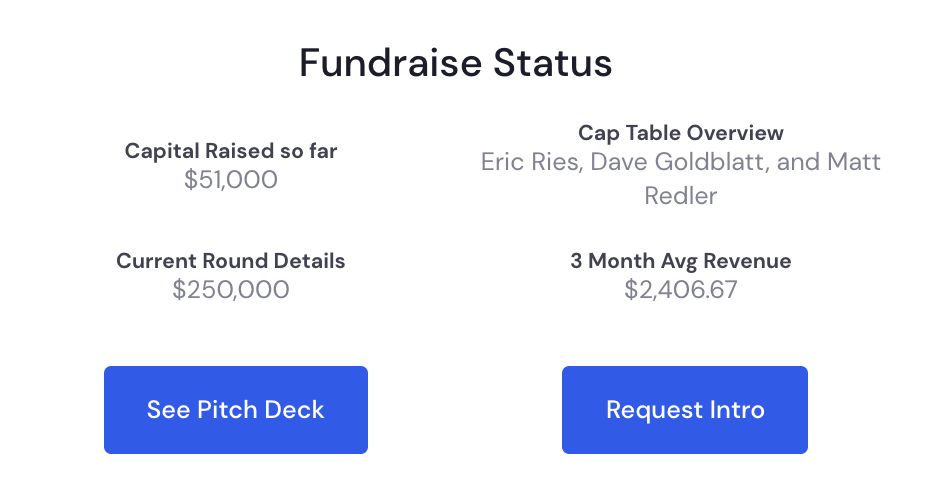 Founder side. Founders are prompted to give their data of their startup to be listed in the system. (this is what you see above). This is contrary to sites like Crunchbase or Zoominfo where they scrape data across the web and then charge a monthly subscription to access it. For later-stage companies this works pretty well since there is lots of data to scrap and go through, making it more accurate for investors looking to invest. But with pre-seed and seed startups, especially ones on the outside of Silicon Valley, there is little to no information about them on the web, causing the big data scrapers to overlook them.