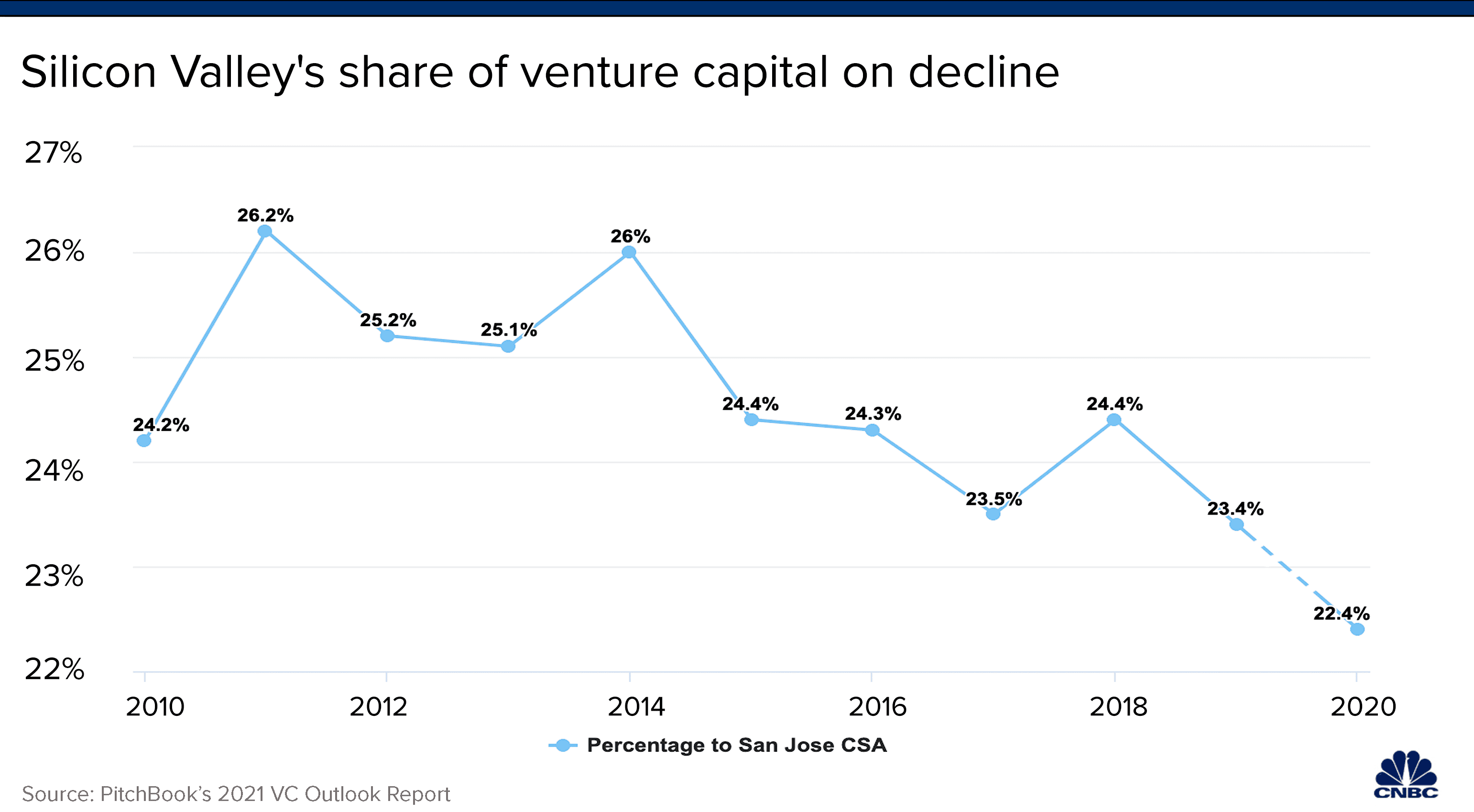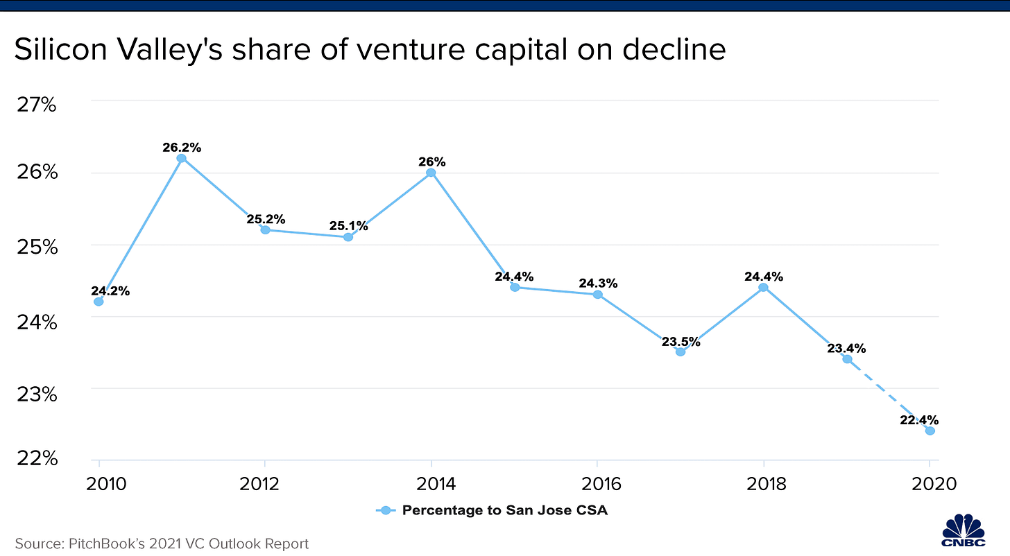 When I say that capital is transferring out of SF I don’t mean that SF is “dead” or whatever shit posters on Twitter say. I am simply saying that SF is not as powerful as it used to be. Look at this chart of the past ten years of the percentage of venture capital in SF. I’m referencing this because I believe if you extend that graph ten, twenty years you will see the percentage go much lower, and for two reasons: