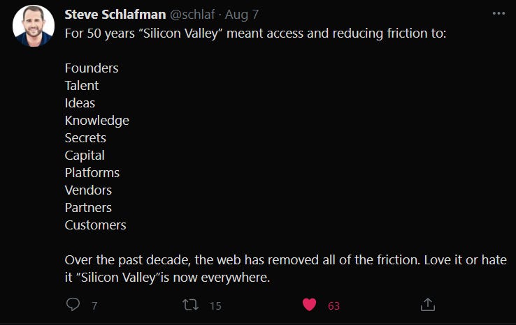 Note: I want to preface this article with that I don’t think Silicon Valley is evil. The innovation and pure talent that has congregated there over the past few decades is very much inspiring and should be recognized. But, I also believe that great entrepreneurs and builders not in Silicon Valley don’t have the same shot as someone who is. That’s not to take anything from well-connected people in SF but talent lives everywhere and accessing it is becoming a huge market.