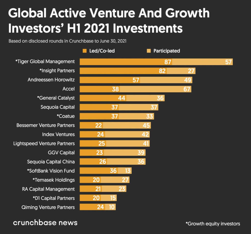 This all factors into the numbers game these VCs are playing. If one VC misses out on the next Uber or Airbnb by not throwing a 25k check into the pot at the early stages, they probably won’t keep their job. So, they throw money everywhere and see where it sticks. One of these players who has done this at a rapid rate recently is Tiger Global. I can’t even give an up-to-date number on how many companies they’ve funded this year because they close a deal a day, but here is a graph showing their monster year to date as of H1 2021.