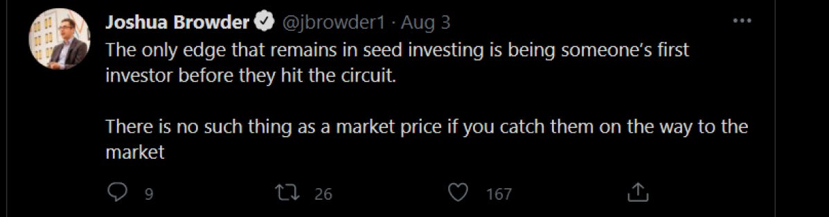 Insider-led companies are automatically shown the best investors, welcomed with a warm intro, and written a check within a few weeks/months. This is for good reason. The investors know them and know that their money is safer than some joe schmo off the street. Let me be clear that these people deserve it. They worked their ass off to get on the inside and most likely will become successful in some way. But there is a whole market of first-time founders or founders who had a rough go the first time and are not represented in this group.